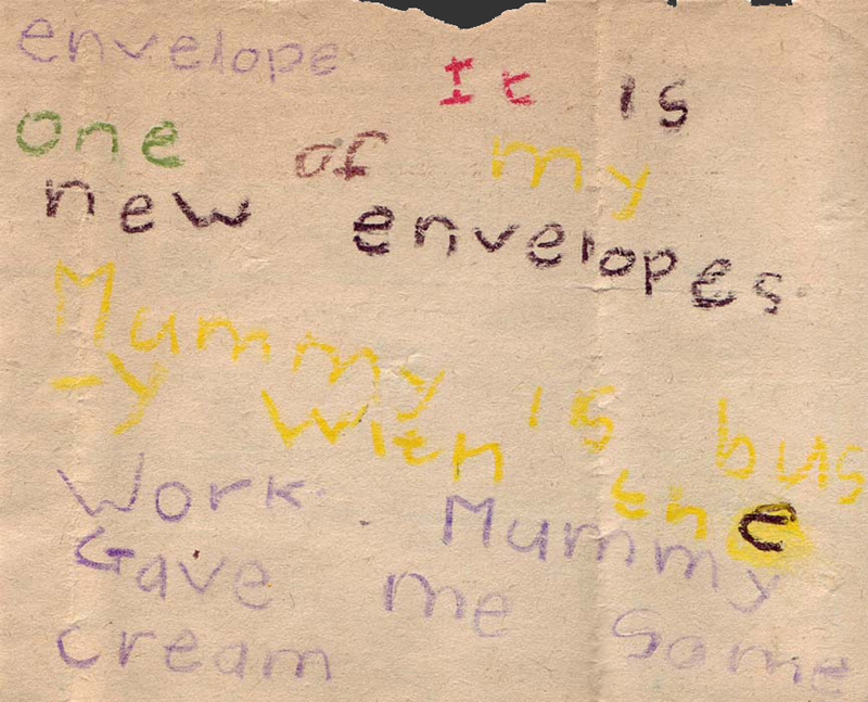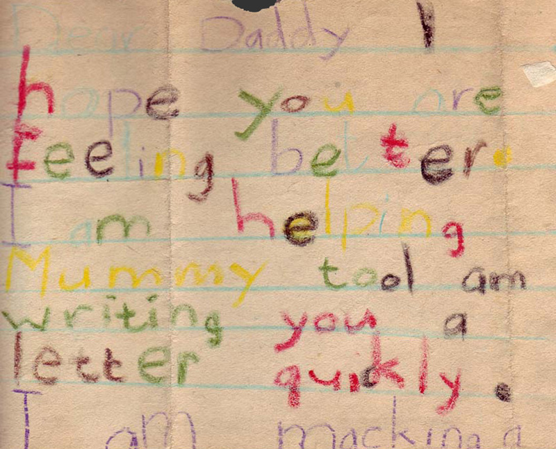 Dear Daddy I hope you are feeling better. I am helping Mummy to. I am writing you a letter quickly. I am macking a envelope It is one of my new envelopes.