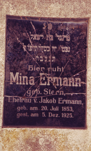 The gravestone of Mina Ermann, wife of Jakob, is evidence of vandalism in graveyards practised by the Nazis.