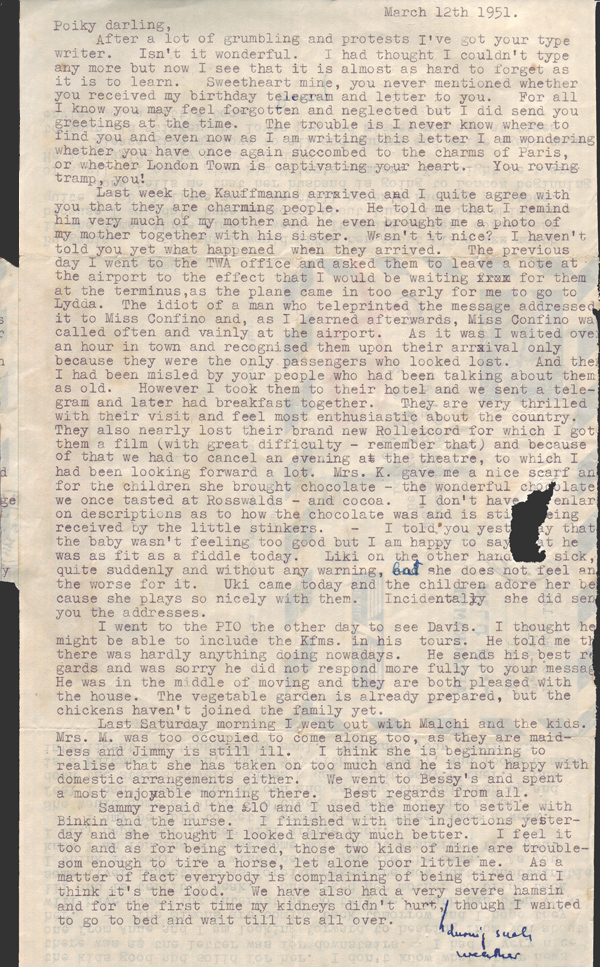 Last week the Kauffmanns arrived and I quite agree with you that they are charming people. He told me that I remind him very much of my mother and he even brought me a photo of my mother together with his sister. Wasn’t it nice? I haven’t told you yet what happened when they arrived. The previous day I went to the TWA office and asked them to leave a note at the airport to the effect that I would be waiting for them at the terminus, as the plane came in too early for me to go to Lydda. The idiot of a man who teleprinted the message addressed it to Miss Confino and, as I learned afterwards, Miss Confino was called often and vainly at the airport. As it was I waited over an hour in town and recognised them upon their arrival only because they were the only passengers who looked lost. And then I had been misled by your people who had been talking about them as old. However I took them to their hotel and we sent a telegram and later had breakfast together. They are very thrilled with their visit and feel most enthusiastic about the country. They also nearly lost their brand new Rolleicord for which I got them a film (with great difficulty – remember that) and because of that we had to cancel an evening at the theatre, to which I had been looking forward a lot. Mrs K. gave me a nice scarf and for the children she brought chocolate – the wonderful chocolate we once tasted at Rosswalds – and cocoa. I don’t have to enlarge on descriptions as to how the chocolate was and is still being received by the little stinkers. I told you yesterday that the baby wasn’t feeling too good but I am happy to say that he was as fit as a fiddle today. Liki on the other hand was sick quite suddenly and without any warning, but she does not feel any the worse for it. Uki came today and the children adore her because she plays so nicely with them. Incidentally she did send you the addresses.