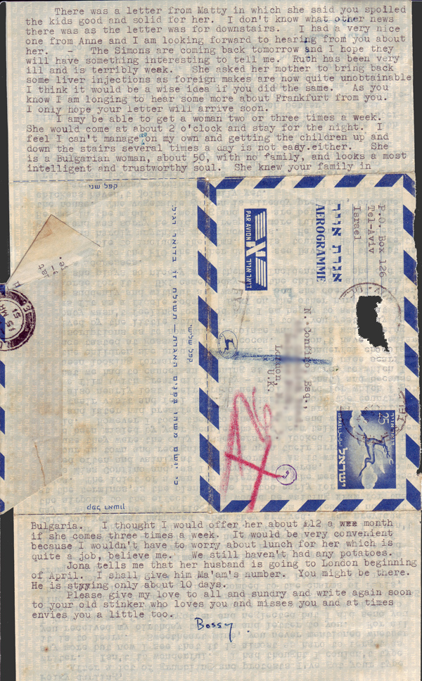 I may be able to get a woman two or three times a week. She would come at about 2 o’clock and stay for the night. I feel I can’t manage all on my own and getting the children up and down the stairs several times a day is not easy either. She is a Bulgarian woman, about 50, with no family, and looks a most intelligent and trustworthy soul. She knew your family in Bulgaria. I thought I would offer her about £12 a month if she comes three times a week. It would be very convenient because I wouldn’t have to worry about lunch for her which is quite a job, believe me. We still haven’t had any potatoes.