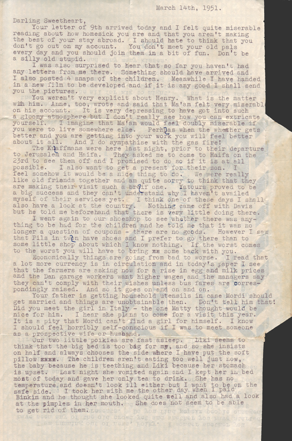 Your father is getting household utensils in case Mordi should get married and things are unobtainable then. Don’t tell him that! Did you meet the girl in Italy – the one Matty thought would be nice for him? I hear she plans to come for a visit this year. It is a pity that Mordi can’t find a girl for himself. I know I should feel horribly self-conscious if I was to meet someone as a prospective wife or husband.