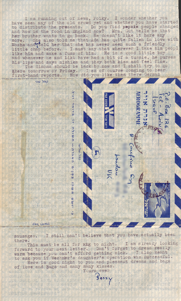 I am running out of news, Poiky. I wonder whether you have seen any of the old crowd yet and whether you have started to distribute the presents. Do you find people changed? And how is the food in England now? Mrs Gut tells me that her brother wants to go back. He doesn’t like it here any more. She also told me that Ada has quite fallen in love with Moshe and had told her that she has never seen such a friendly little chap before. I must say that wherever I take him people like him and make a fuss of him. He is a good little boy and whenever he and Liki have had a bit of a tussle, he purses his lips and says nishika and they both kiss and feel fine.