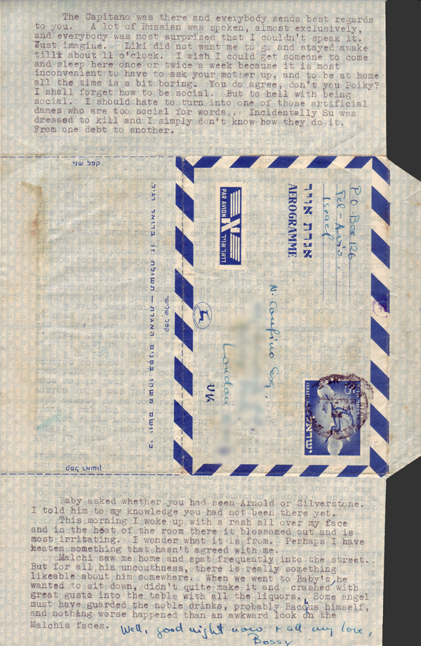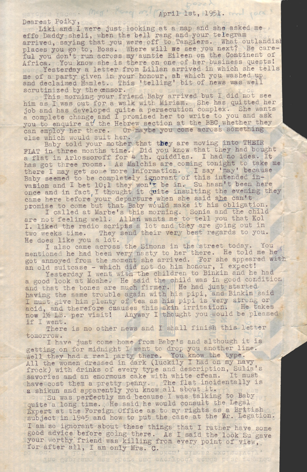 I have just come home from Baby’s and although it is getting on for midnight I want to drop you another line. Well they had a real party there. You know the type. All the women dressed in dark (luckily I had on my navy frock) with drinks of every type and description, Sulia’s savouries and an enormous cake with white cream. It must have cost them a pretty penny. The flat incidentally is a shikun and apparently you know all about it.