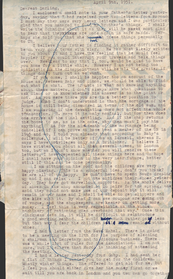 If you come, I shall be happier too on account of the house as, between Baby and Simon, we should be able to find out what is what. The trouble is that not knowing anything about these matters, I don’t always know what questions to ask Simon or to know whether his answer is to the point or not. As you were there you are in a better position to judge. What I don’t understand is that the mortgage of the house is still being discussed in terms of the old sum, and I am wondering if the devaluation does not affect the whole transaction. S. says it is only nominal, but how then does one arrive at the final settling? And if the chap returns the house to me, as is the case, why then must I pay him anything? As for the nine-tenth of the mortgage being cancelled if I can prove to have been a member of the UN in 1945 and 48, I told you already that according to Baby’s colleague, I will be better off as an Israeli, whereas S. says I have privileges only as a Britisher. I believe I have written you about all this several times, to London too, but as I don’t know whether you will receive these letters, I have repeated all these things here and do hope I shall have your opinion in the very near future, better still if this can be done personally.