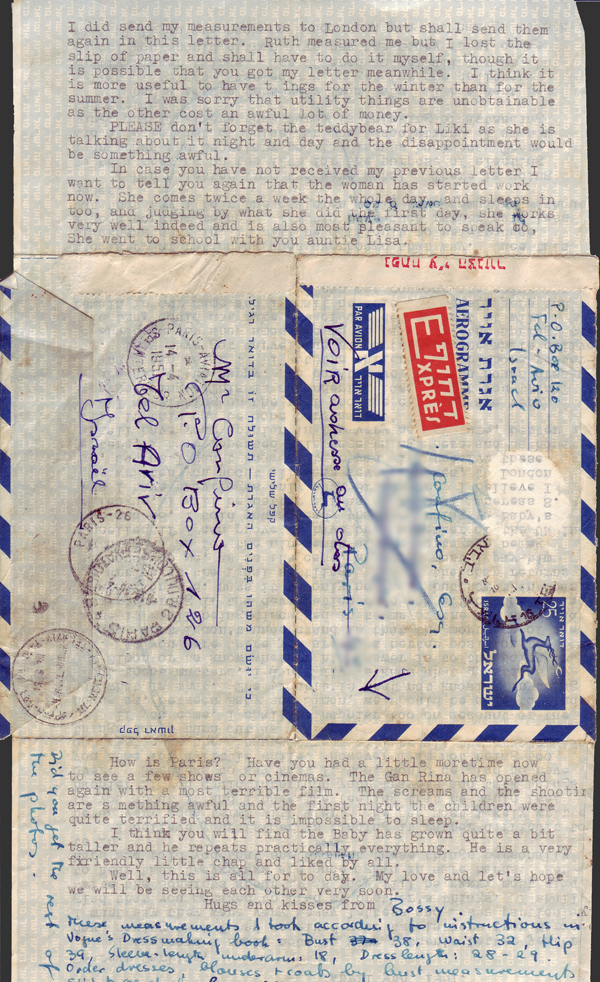 I had a letter yesterday from Gaby. I had sent her a list of things I wanted you to get for the children. Mostly winter things. She offered to get all for me, but I feel you should either give her the money first or we wait till you are back in London and you two can go together. I did send my measurements to London but shall send them again in this letter. Ruth measured me but I lost the slip of paper and shall have to do it myself, though it is possible that you got my letter meanwhile. I think it is more useful to have things for the winter than for the summer. I was sorry that utility things are unobtainable as the other cost an awful lot of money.