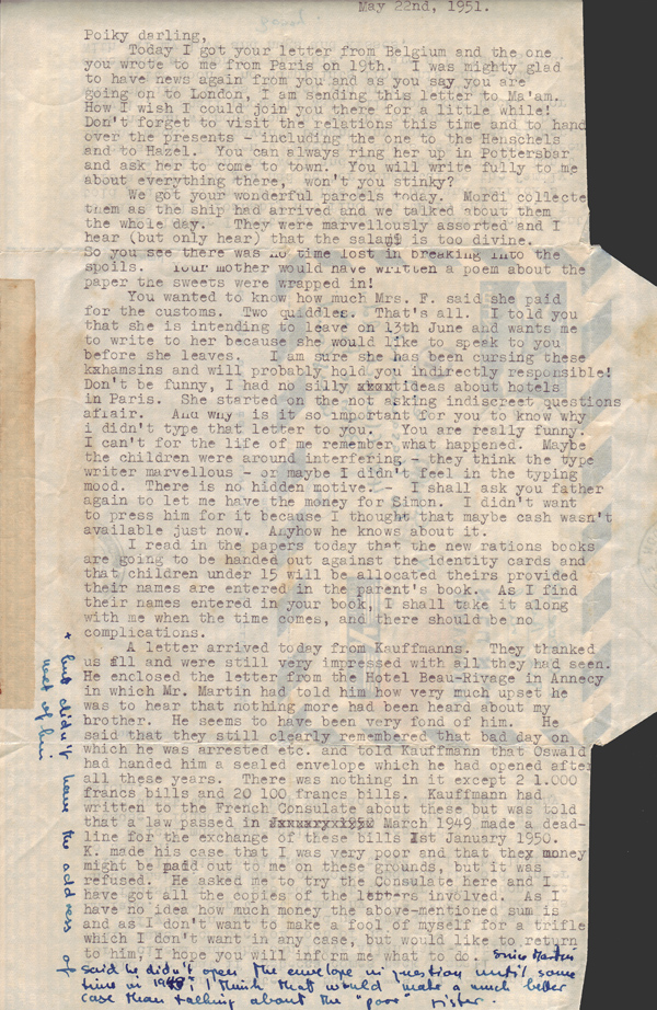 A letter arrived today from Kauffmanns. They thanked us all and were still very impressed with all they had seen. He enclosed the letter from the Hotel Beau-Rivage in Annecy in which Mr Martin had told him how very much upset he was to hear that nothing more had been heard about my brother. He seems to have been very fond of him. He said that they still clearly remembered that bad day on which he was arrested etc. and told Kauffmann that Oswald had handed him a sealed envelope which he had opened after all these years. There was nothing in it except 2 1,000 francs bills and 20 100 francs bills. Kauffmann had written to the French Consulate about these but was told that a law passed in March 1949 made a deadline for the exchange of these bills 1st January 1950. K. made his case that I was very poor and that the money might be paid out to me on these grounds, but it was refused. He asked me to try the Consulate here and I have got all the copies of the letters involved. As I have no idea how much money the above-mentioned sum is and as I don’t want to make a fool of myself for a trifle which I don’t want in any case, but would like to return to him, I hope you will inform me what to do. Since Martin said he didn’t open the envelope in question until some time in 1949, but didn’t know the address of the next of kin, I think that would make a much better case than talking about the “poor” sister.