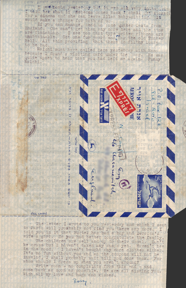 You wanted to know how much Mrs F. said she paid for the customs. Two quiddles. That’s all. I told you that she is intending to leave on 13th June and wants me to write to her because she would like to speak to you before she leaves. I am sure she has been cursing these khamsins and will probably hold you indirectly responsible! Don’t be funny, I had no silly ideas about hotels in Paris. She started on the not asking indiscreet questions affair. And why is it so important to you to know why I didn’t type that letter to you? You are really funny. I can’t for the life of me remember what happened. Maybe the children were around interfering – they think the typewriter marvellous – or maybe I didn’t feel in the typing mood. There is no hidden motive. I shall ask your father again to let me have the money for Simon. I didn’t want to press him for it because I thought that maybe cash wasn’t available just now. Anyhow he knows about it.