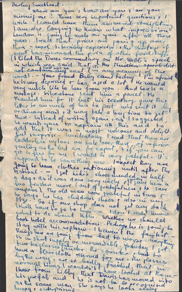 Where are you, how are you and are you missing me? Three very important questions and I am also longing to know what impression London is going to make on you after all these years. I read that prices are going up over there – wool is terribly expensive and the shortage of meat has increased the price of other foodstuffs. (I liked The Times commentary on Mr Webb’s speech in which was said that there was no meat in it, in any meaning of the word.) Your friend Baby came today. I am afraid he is very depressed and has aged a lot. He would very much like to hear from you. And here is a message. Silverstone sent him a parcel. He thanked him for it but his secretary gave the letter to an uncle of hers to post who sent it by ordinary mail and it may take a long time to get there. Instead of writing again, as I suggested, he wants you to explain all this and to add that it was a most welcome and delightful surprise. Incidentally I read that there are ladderless nylons on sale over there, of inferior quality as the best are for export, and if you can get a few for me I would be very grateful. It’s supposed to be something new. I expect they are going to leave clothes rationing until after the Festival. I got Liki’s shoes mended in half a day and it was done very nicely and quickly. I gave him a few piasters more (out of gratefulness and to save coupons). The old man was grateful in turn and he says he has children’s shoes and also in my size. So if our shop does not get any stock I shall have to go to him. I don’t really know what to do about Kfm.. Whether we should book hotel accommodation. Perhaps he is going to stay with his nephew. I haven’t the faintest. Things here are going from bad to worse. Everything is in short supply or unobtainable. Yesterday I got two tea glasses from under the counter and had to have a floorcloth reserved for me. The glasses, by the way, are so badly finished that in normal times I wouldn’t have looked at them. I hear from Libby that Davis has moved into his prefab and he is not to be recognised as the same man. She says he looks really happy, enterprising.