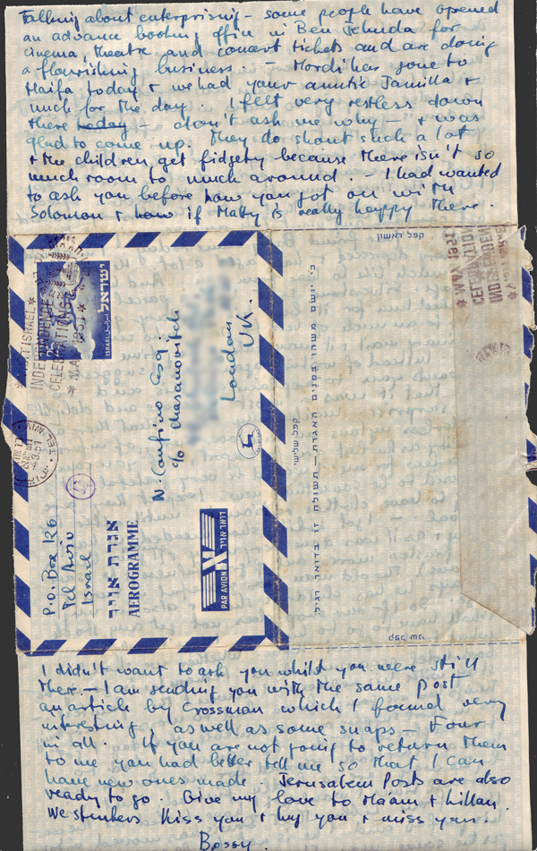 Talking about enterprising – some people have opened an advance booking office in Ben Jehuda for cinema, theatre and concert tickets and are doing a flourishing business. Mordi has gone to Haifa today and we had your auntie Jamilla and uncle for the day. I felt very restless down there – don’t ask me why – and was glad to come up. They do shout such a lot and the children get fidgety because there isn’t so much room to muck around. I had wanted to ask you before how you got on with Solomon and if Matty is really happy there. I didn’t want to ask you whilst you were still there. I am sending you with the same post an article by Crossman which I found very interesting, as well as some snaps – four in all. If you are not going to return them to me you had better tell me so that I can have new ones made. Jerusalem Posts are also ready to go. Give my love to Ma’am and (unintelligible).