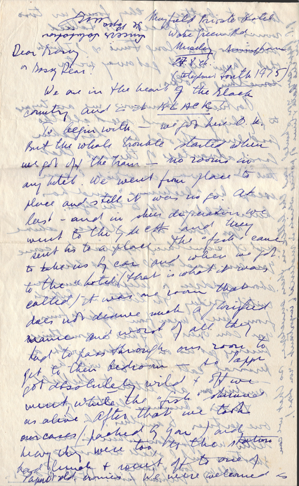 To begin with – we got here O.K. but the whole trouble started when we got off the train – no rooms in any hotel. We went from place to place and still it was no go. At last – and in sheer desperation, we went to the (unintelligible) and they sent us to a place. The “fish” came to take us by car and when we got to the “hotel” (that is what it was called) it was one room that does not deserve such a dignified name and worst of all they had to pass through our room to get to their bedroom – so Pappi got absolutely wild and off we went, while the “fish” skinned us alive. After that we took our cases (packed by you) and heavy they were too, to the station, had lunch and went off to one of Pappi’s old cronies. We were welcomed as long lost brothers and they found us two rooms in this place. We talked business for a long time and I think that Pappi might get away with something or other.