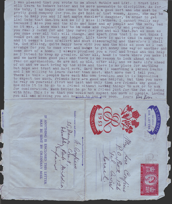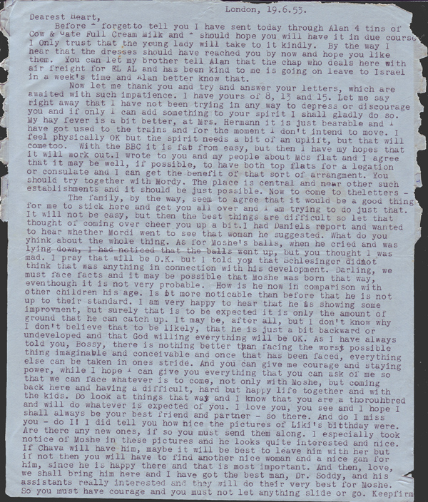 The family, by the way, seem to agree that it would be a good thing for me to stick here and get you all over and I am trying to do just that. It will not be easy, but then the best things are difficult so let that thought of coming over cheer you up a bit. I had Daniel’s report and wanted to hear whether Mordi went to see that woman he suggested. What do you think about the whole thing? As for Moshe’s balls, when he cried and was lying down, I had noticed that the balls went up, but you thought I was mad. I pray that will be O.K. but I told you that Schlesinger did not think that was anything in connection with his development. Darling, we must face facts and it may be possible that Moshe was born that way, even though it is not very probable. How is he now in comparison with other children his age? Is it more noticeable than before that he is not up to their standard? I am very happy to hear that he is showing some improvement, but surely that is to be expected it is only the amount of ground that he can catch up. It may be, after all, but I don’t know why I don’t believe that to be likely, that he is just a bit backward or undeveloped and that God willing everything will be OK. As I have always told you, Bossy, there is nothing better than facing the worst possible thing imaginable and conceivable and once that has been faced, everything else can be taken in one’s stride. And you can give me courage and staying power, while I hope I can give you everything that you can ask of me so that we can face whatever is to come, not only with Moshe, but coming back here and having a difficult, hard but happy life together and with the kids. Do look at things that way and I know that you are a thoroughbred and will do whatever is expected of you. I love you, you see and I hope I shall always be your best friend and partner – so there. And do I miss you – do I! I did tell you how nice the pictures of Liki’s birthday were. Are there any new ones, if so you must send them along. I especially took notice of Moshe in these pictures and he looks quite interested and nice. If Chava will have him, maybe it will be best to leave him with her but if not then you will have to find another nice woman and a nice gan for him, since he is happy there and that is most important. And then, love, we shall bring him here and I have got the best man, Dr. Soddy, and his assistants really interested and they will do their very best for Moshe. So you must have courage and you must not let anything slide or go. Keep firm. I was pleased that you wrote to me about Ruthie and Liki. I trust Liki will learn to behave better and be more amenable to discipline. As for the baby, I am happy she seems to be such a good sort and she must be pretty good company for you. Do get hold of that woman, Asseo, she may be able to help you and if not maybe Weksler’s daughter, in order to get Liki into that Gan. You ask me if I miss life there. I cannot really say because I miss you and the kids and home and my people and the work, bad as it was, I know what was to be done and regularity and people who you really cared for and they cared for you and all that. But as soon as you come over all this will change. And apart from that I do not think I could get on in Israel any longer. Life there is quite dead in many ways and it seems a loss of effort and most discouraging and therefore I shall arrange for you to come over and manage to get money one way or another and some sort of a home. I always promised you a roof and bread and God help me I intend to keep my promise. After all, home is there where you make it and we have been good pals and there is no reason to look ahead with fear or apprehension. We are not so old, after all, and we have life ahead of us and we must bring up the kids and there is no place for anything but hope and trust and hard work. Hard work is something a person learns and I am willing to learn faster than most. What more can I tell you. There is this – people have each his own troubles and it is impossible to expect too much. Friends here are good and helpful, but then you have to rely on yourself first and last and only then are friends any good. How nice it is to go to a friend without having things to ask or to ask for commiseration. Much better to go to a friend just for the fun of being with him. This is so that you would not expect too much of people. Loving you all and missing you and hoping to see you soon.