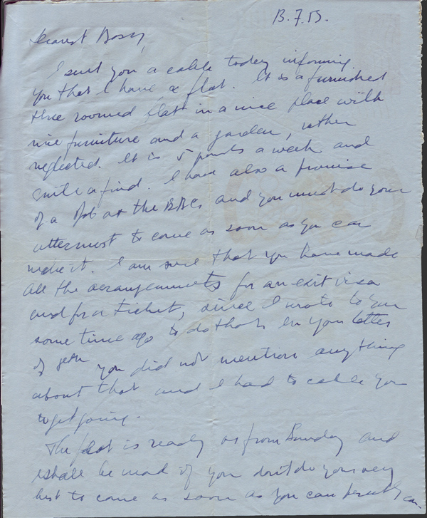 I sent you a cable today informing you that I have a flat. It is a furnished three roomed flat in a nice place with nice furniture and a garden, rather neglected. It is 5 pounds a week and quite a find. I have also a promise of a job at the BBC, and you must do your uttermost to come as soon as you can make it. I am sure that you have made all the arrangements for an exit visa and for a ticket, since I wrote to you some time ago to do that. In your letter of 8th you did not mention anything about that and I had to cable you to get going.