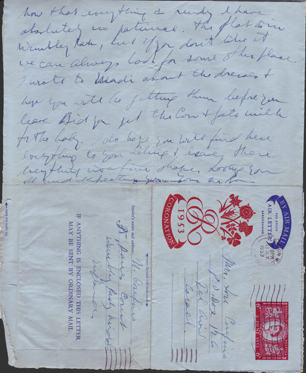 The flat is ready as from Sunday and I shall be mad if you don’t do your very best to come as soon as you can possibly come. Now that everything is ready I have absolutely no patience. The flat is in Wembley Park, but if you don’t like it we can always look for some other place. I wrote to Mordi about the dresses. I hope you will be getting them before you leave. Did you get the Cow & Gate milk for the baby? I do hope you will find here everything to your liking and leave there everything in a fine shape. Loving you all and expecting you.