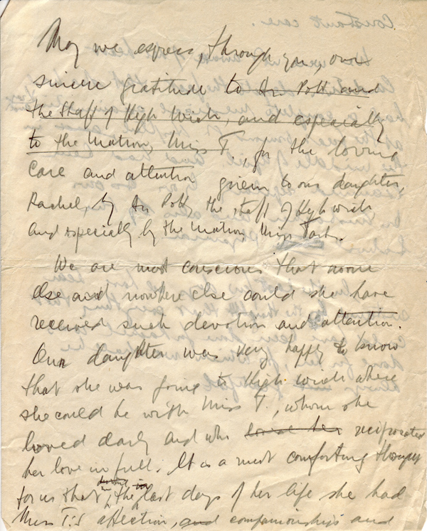 May we express, through you, our sincere gratitude for the loving care and attention given to our daughter, Rachel, by (unintelligible) the staff of High Wick and especially by the Matron, Miss (unintelligible).
