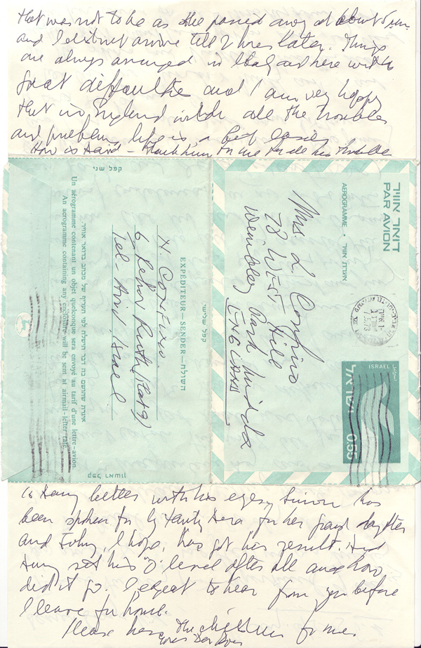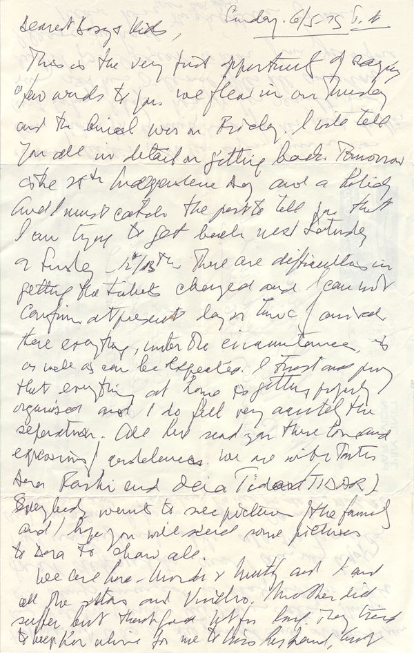 This is the very first opportunity of saying a few words to you. We flew in on Thursday and the burial was on Friday. I will tell you all in detail on getting back. Tomorrow is the (unintelligible) Independence Day and a holiday and I must catch the post to tell you that I am trying to get back next Saturday or Sunday -12th/13th. There are difficulties in getting the tickets changed and I cannot confirm at present day or time of arrival. Here everything, under the circumstances, is as well as can be expected. I trust and pray that everything at home is getting properly organised and I do feel very acutely the separation. All here send you their love and expressions/condolences. We are with Tantes (unintelligible) and Dora TIDAR. Everybody wants to see pictures of the family and I hope you will send some pictures to Dora to show all.
