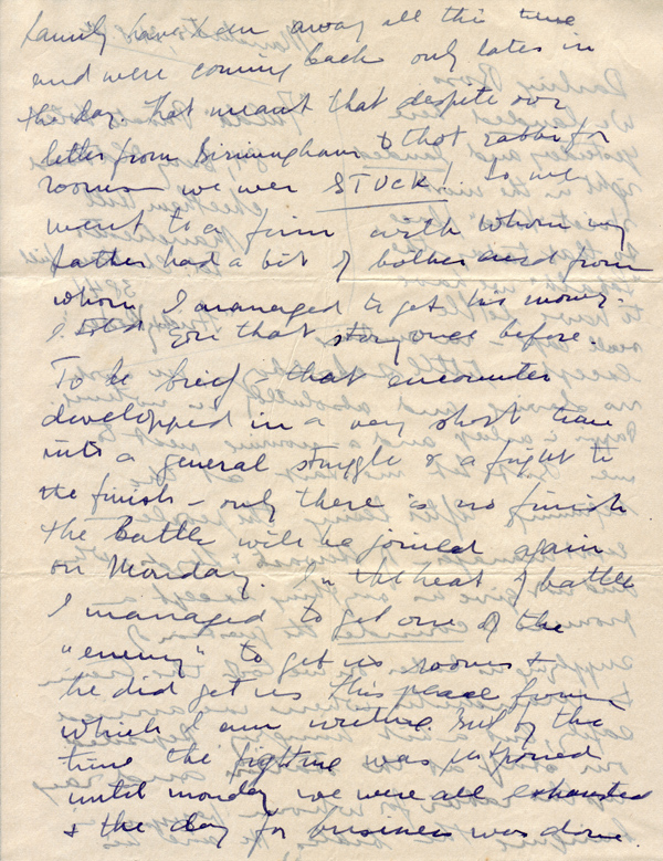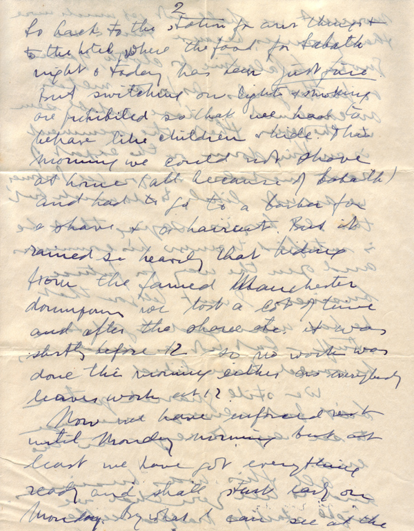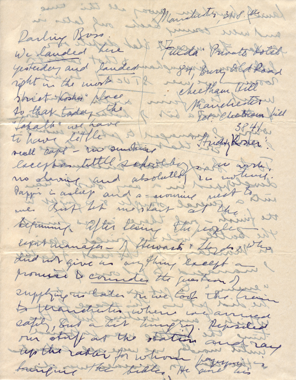We landed here yesterday and landed right in the most strict “kosher” place, so that today the “Sabath” we have to have little scull caps – no smoking except as little schoolboys, no work, no shaving and absolutely no (unintelligible). Pappi is asleep and a-snoring next to me. But let me start at the beginning. After seeing the people – export manager – of Stewarts and Lloyds, who did not give us anything except a promise to consider the question of supplying us later on we took the train to Manchester where we arrived safely, but a bit hungry. Deposited our stuff at the station and rang up the rabbi for whom (unintelligible) is bringing the bibles. He said his family have been away all this time and were coming back only later in the day. That meant that despite our letter from Birmingham to that rabbi for rooms we were STUCK! So we went to a firm with whom my father had a bit of bother and from whom I managed to get his money. I told you that story once before. To be brief – that encounter developed in a very short time into a general struggle and a fight to the finish – only there is no finish the Battle will be joined again on Monday. In the heat of battle I managed to get one of the “enemy” to get us rooms and he did get us this place from which I am writing. But by the time the fighting was postponed until Monday we were all exhausted and the day for business was done. So back to the station for our things and to the hotel, where the food on Sabath night and today has been just fine but switching on lights and smoking are prohibited so that we had to behave like children and hide. This morning we could not phone at home (all because of Sabath) and had to go to a barber for a shave and a haircut. But it rained so heavily that hiding from the famed Manchester downpour we lost a lot of time and after the shave etc. it was shortly before 12 so no work was done this morning either as everybody leaves work at 12.