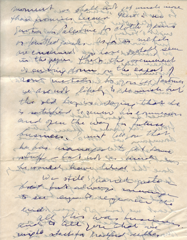 Now we have enforced rest until Monday morning but at least we have got everything ready and shall start early on Monday. By what I can see at the moment we shall not get much more than promises, because there is no quota for Palestine for cloth, yarns or knitted garments. As far as metals are concerned you have probably seen in the papers that the Government is cutting down on the export of some metals. So you see, Partner, we are not likely to do much but the old boy is saying that he is satisfied to know his (unintelligible) and open the way for future business. I must tell you that he has managed to get some stuff – but not as much as he would have liked.