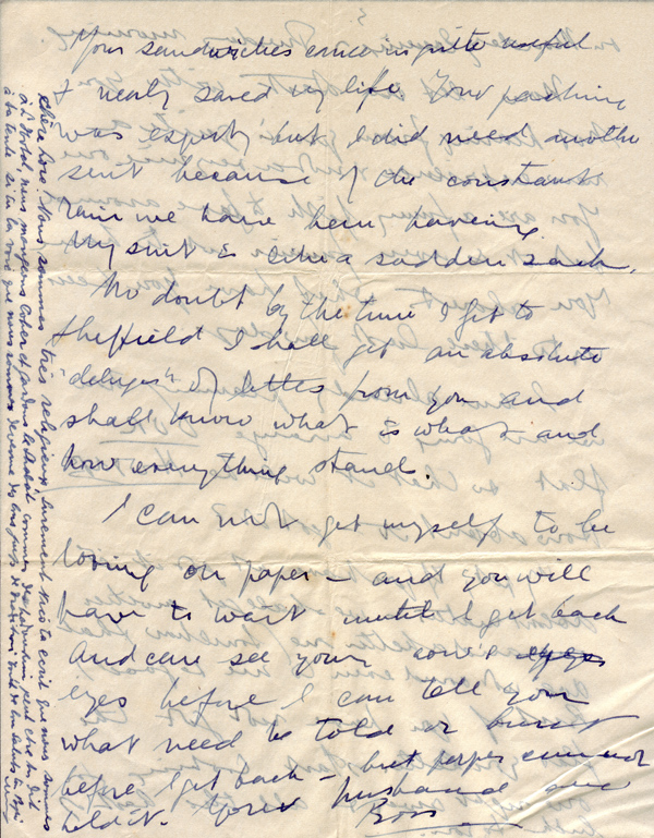 I cannot get myself to be loving on paper – and you will have to wait until I get back and can see your cows’ eyes before I can tell you what needs to be told or (unintelligible) before I get back – but paper cannot hold it. Your husband and Boss.