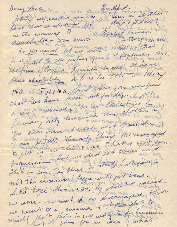 As per usual let me write first of all to the partner of the firm of Confino. Business is nil. We have done absolutely a b s o l u t t t t e l l l l y NO THING. And when you imagine that we have been wet for days and got a real shower (as in Palestine in January only here with our clothes on) you can form some sort of an idea of our plight. The only thing we managed to get is no this and no that, not even promises – but we did get their word that as soon as there is stuff (which is not the case now) Pappi will get some. Let’s hope this is so. By about 4 o’clock we were so wet and so discouraged that we went to a cinema and I thought to myself that this is no way to do business but it gives you an idea of what the business prospects are and what the weather was like. Add to all this that we had no cigarettes and you have the picture complete.
