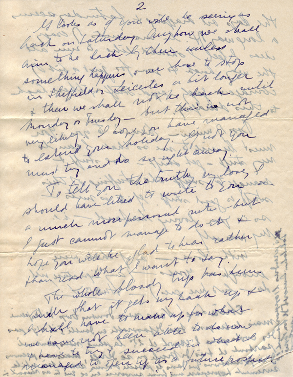 It looks as if you will be seeing us back on Saturday. Anyhow we shall aim to be back by then unless something happens and we have to stop in Sheffield or Leicester a bit longer and then we shall not be back until Monday or Tuesday – but this is not very likely. I hope you have managed to extend your holiday. If not you must try and do so right away.