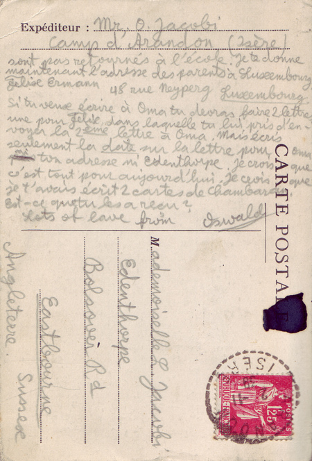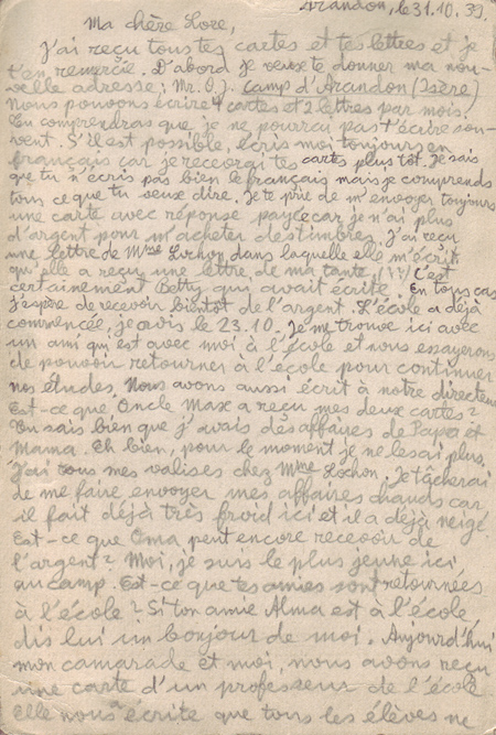 I have received all your cards and letters and thank you for them. In the first place I want to give you my new address. We are allowed to write 4 postcards and 2 letters per month. You will understand that I cannot write to you often. If possible, always write to me in French. I will receive your cards quicker. I know your French is not very good but I understand everything you want to say. Please always send me a card with reply paid because I don’t have any more money to buy stamps. I received a letter from Mme Lochon in which she tells me that she received a letter from my aunt (??) – that must surely be Betty who has written to me. In any event I hope to receive some money soon. Our school has started already, I think on 23rd October. I am here with a friend from school and we are trying to return to school to continue with our studies. We have also written to our Directeur. Has Uncle Max received my two cards? You know I have Papa’s and Mama’s things. Well, at the moment I don’t have them any more. I left all my bags with Mme. Lochon. I am trying to have my warm clothes sent to me. It is already very cold here and it has already snowed. Can Oma still receive money? I am the youngest here in the camp. Have your friends returned to school? If your friend Alma has returned to school give her my regards. Today, my friend and I received a card from one of the teachers at the school. She told us that not all the pupils have returned to school. I now give you the address of family in Luxembourg. Felix Ermann, *, Luxembourg. If you want to write to Oma, you must write 2 letters – one to Felix in which you ask him to post on the second to Oma. But only write the date on Oma’s letter – not Edenthorpe or the address. I think this is all for today. I think I sent you two cards from Chambaran.