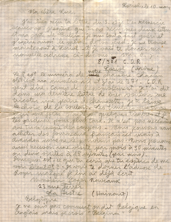 The 8 is the number of our room. Everyone gets a number here and mine is 371. C.D.R. means Transit Camp. In my last letter I asked you to kindly knit me a pair of socks. I will leave the choice of colour to you. The stamps that you received are pretty. I have also got some stamps and I will keep them for later. It is not necessary for you to send me coupons. - We can buy ourselves french newspapers here but at Arandon we couldn't. We can also receive one visit per month of 30 minutes or two visits of 15 minutes (per month). Why did you write that you hope to see me soon? I am going to give you the address of Roger Naveaux