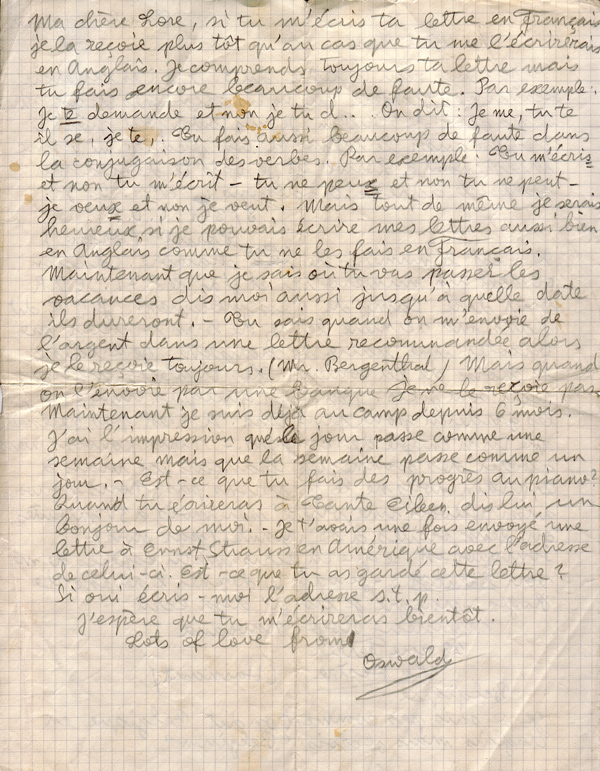 I don't know how you say Belgian in English, but I know 'Belgium'. My dear Lore, if you write your letter to me in French I receive it quicker than if you write it to me in English. I always understand your letter but you still make a lot of mistakes. For example: Je te demande and non je tu d.. One says: Je me, tu te, il se, je te .. You also make a lot of mistakes with the conjugation of verbs. For example: Tu m'ecris and not tu m'ecrit - tu ne peux and not tu ne peut - je veux and not je veut. But all the same I would be happy if I could write my letters as well in English as you do in French. Now that I know where you are going to spend the holidays tell me too how long they last. Do you know that when I am sent money in a registered letter then I always receive it (Mr Bergenthal). But when I am sent it through a bank, I don't get it. Now I have been at the camp for 6 months already. It feels to me as though the days pass like weeks but the weeks pass like days. Have you made any progress on the piano? When you write to Aunt Eileen say hello to her from me. I once sent you a letter to Ernst Strauss in America with his address. Have you kept this letter? If yes write to me and tell me his address please.