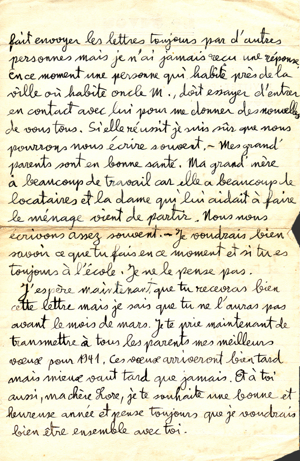 I have written several times to Uncle M. and I always had to send the letters through other people but I have never received a reply. At the moment a person who lives close to the town where Uncle M lives will try to get in contact with him in order to give me news of you all. If she succeeds I am sure that we can write to each other often. My grandparents are in good health. My grandmother has a lot of work for she has a lot of lodgers and the woman who helped her with the housework has just left. We write to each other quite often. I would really like to know what you are doing at the moment and if you are still at school. I don’t think so.