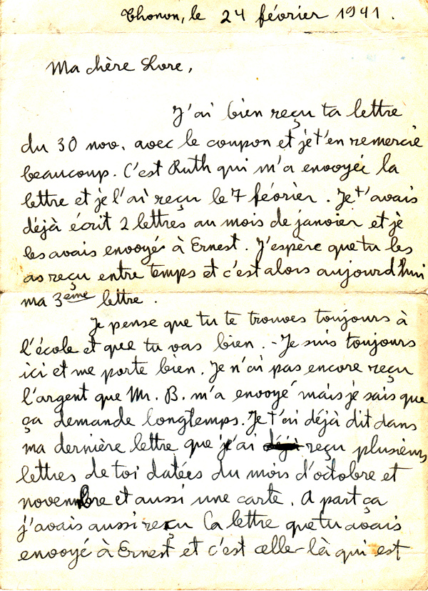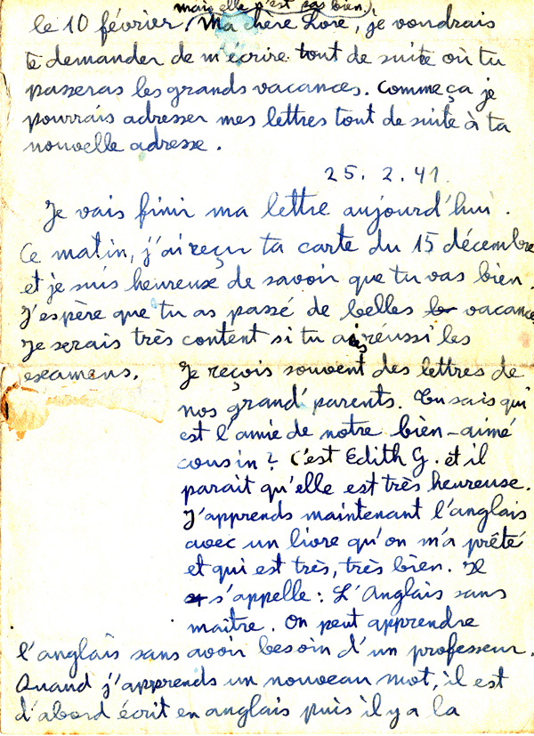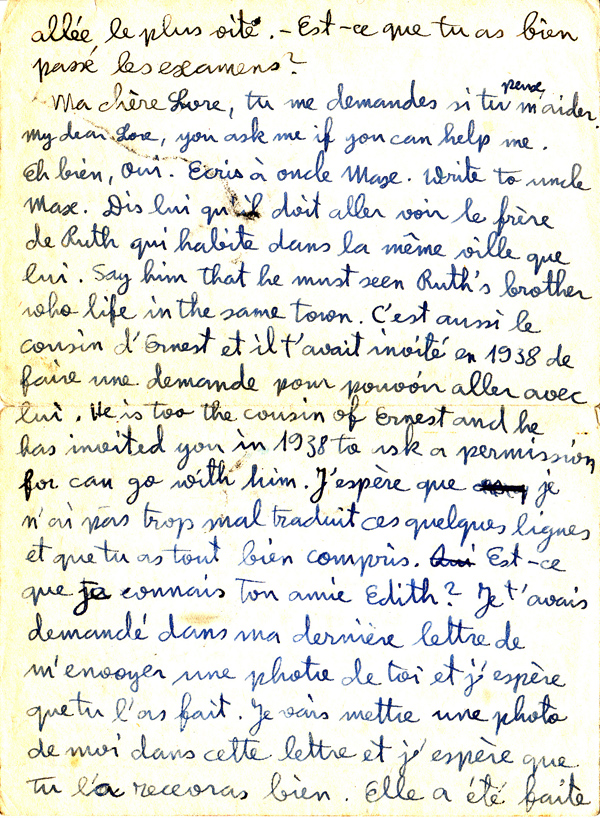 Ah well, yes. Write to Uncle Max. Write to Uncle Max. Tell him that he must go to see Ruth’s brother who lives in the same town as him. Say him that he must seen Ruth’s brother who life in the same town. He is also the cousin of Ernest and in 1938 he invited you to seek permission to go with him. He is too the cousin of Ernest and he has invited you in 1938 to ask a permission for can go with him. I hope that I have not translated these lines too badly and that you have understood everything well. Do I know your friend Edith? I asked you in my last letter to send me a photo of yourself and I hope that you have done so. I am going to put a photo of me in this letter and I hope that you will receive it well. It was taken the 10th February but it is not good. My dear Lore, I would like to ask you to write to me straight away where you will be spending the long holiday, so as I will be able to address my letters to your new address straightaway.