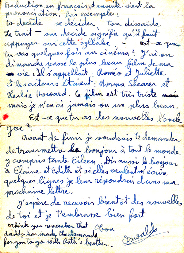 I often receive letters from our grandparents. Do you know who is the friend of our beloved cousin? It is Edith G. and it seems that she is very happy. I am learning English now with a book that I have borrowed and which is very, very good. It’s called English without a Master. One can learn English without requiring a teacher. When I learn a new word it is first written in English then there is translation in French and then comes the pronunciation. For example: