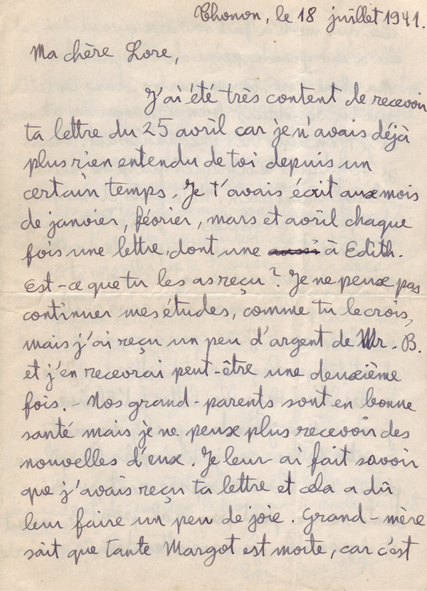 I was very happy to receive your letter from the 25th April as I hadn’t heard anything from you for a while. I wrote a letter to you in January, February, March and April with one to Edith in each time. Have you received them? I can’t continue my studies as you know, but I have received a little money from Mr B. and maybe I will receive some a second time. – Our grandparents are in good health but I can’t receive any news of them anymore. I let them know that I had received your letter and that should have given them a little joy. Grandmother knows that Aunt Margot is dead, for it is her who told me before you did, and she had great pain to learn of it.