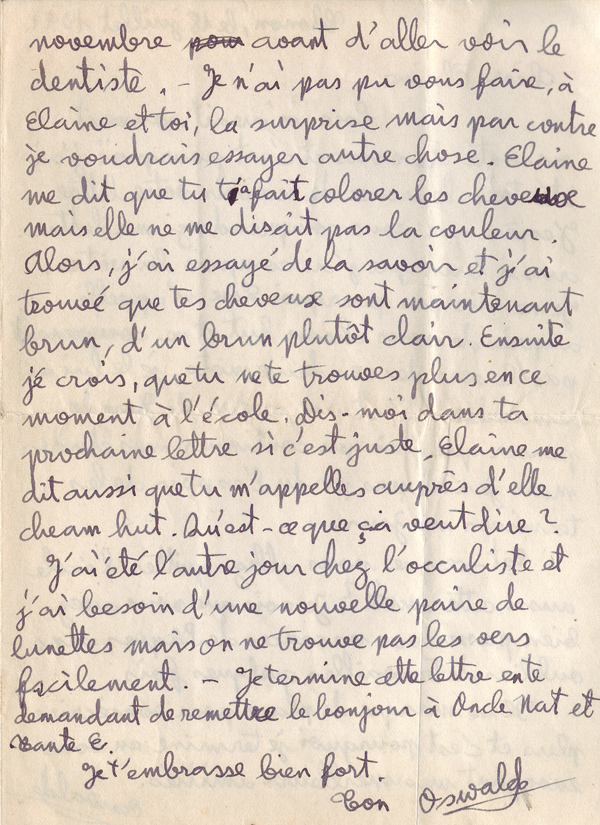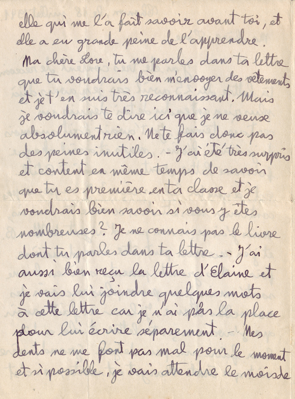 But dear Lore, you tell me in your letter that you would really like to send me some clothes and I am very grateful for it. But I would like to tell you here that I want absolutely nothing. Therefore don’t give yourself any unnecessary trouble. – I was very surprised and happy at the same time to find out that you were first in your class and I really wanted to know if there were many of you there. I don’t know of the book of which you spoke about in your letter. – I have also safely received the letter from Elaine and I am going to enclose some words to her in this letter for I don’t have the room to write to her separately. – My teeth are not hurting me for the moment and if possible, I am going to wait until November before going to see the dentist. – I wasn’t able to give you (Elaine and you) the surprise, but on the other hand I would like to try something else. Elaine told me that you coloured your hair but she didn’t tell me the colour. So I tried to find it out and I found that your hair is still brown, of a lighter brown. Then I believe that you are no longer are at school at the moment. Tell me in your next letter if this is right. Elaine also told me that you call me next to her ‘cheam hut’ (?). What does this mean?