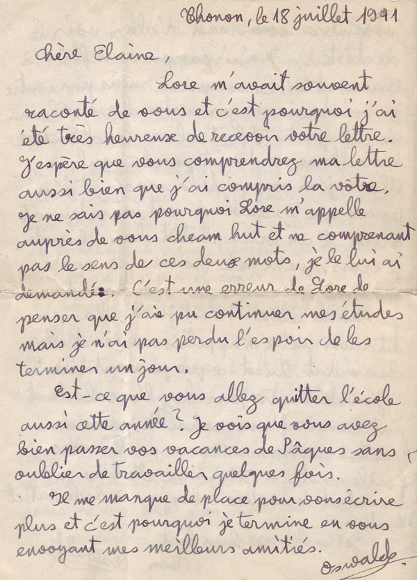 Lore has often told me about you and this is why I was very happy to receive your letter. I hope that you understand my letter as well as I understood yours. I don’t know why Lore calls me next to your cheam hut and not understanding the meaning of these two words, I have asked her about it. It is an error of Lore’s to think that I was able to continue my studies but I have not lost hope of finishing them one day.