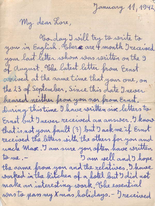 (English in original) To-day I will try to write to you in English. There are 4 month I received your last letter whom was written on the 9 of August. The latest letter from Ernst arrived at the same time that your one, on the 23 of September. Since this date I never heared neither from you nor from Ernst. During this time I have written six letters to Ernst but I never received an answer. I know that is not your fault (?) but I ask me if Ernst received the letters with the others for you and uncle Max. I am sure you often have written to me. - I am well and I hope the same from you and the relatives. I have worked in the kitchen of a hotel but I did not make an interesting work. The essential was to pass my Xmas holidays. - I received the marks of the first term and I am the eleventh from 20 pupils. That is not very well but I began after the others and first I made again the work of the first scholastic year. You will seen I make better in the 2nd term.