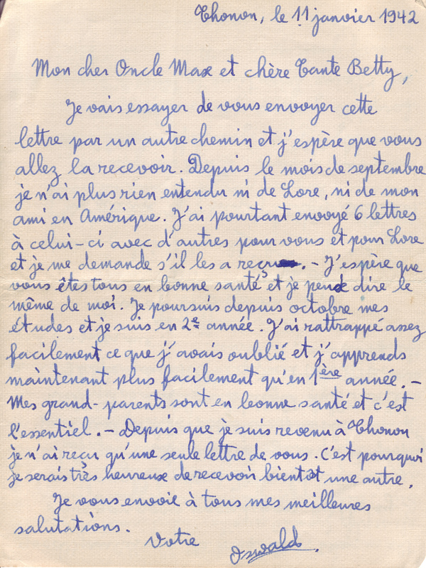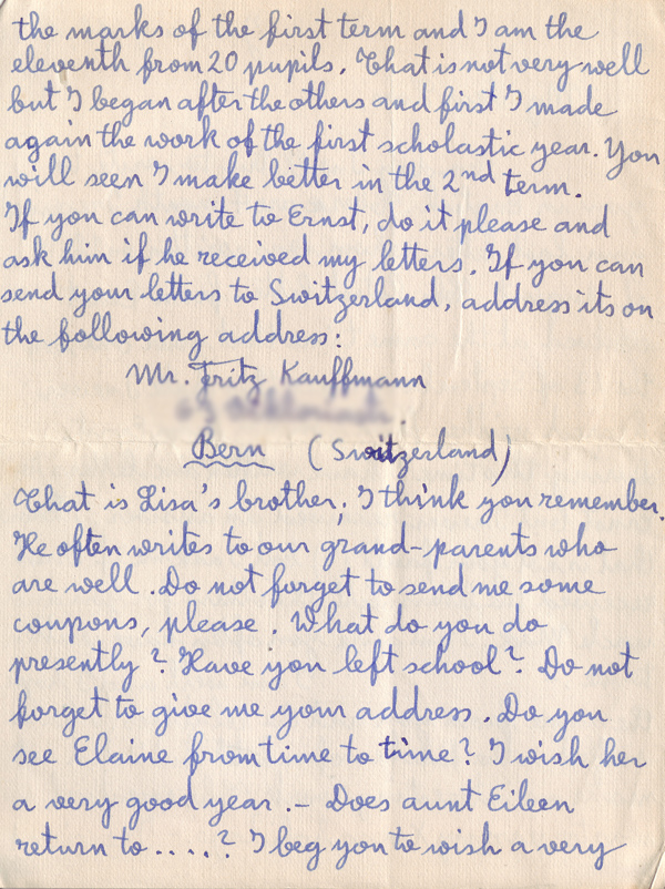 I am going to try to send you this letter via another way and I hope that you are going to receive it. Since September I have not heard anything more neither from Lore nor from my friend in America. I have however sent 6 letters to him with others for you and for Lore and I wonder if he has received them. – I hope that you are both in good health and I can say the same of myself. Since October I have pursued my studies and I am in the 2nd year. I have caught up what I had forgotten quite easily and now I am learning more easily than in the 1st year. – My grandparents are in good health and that is the main thing. – Since I came back to Thonon I have only received a single letter from you. For this reason, I would be very happy to receive another soon.