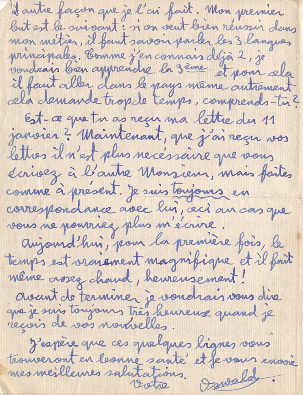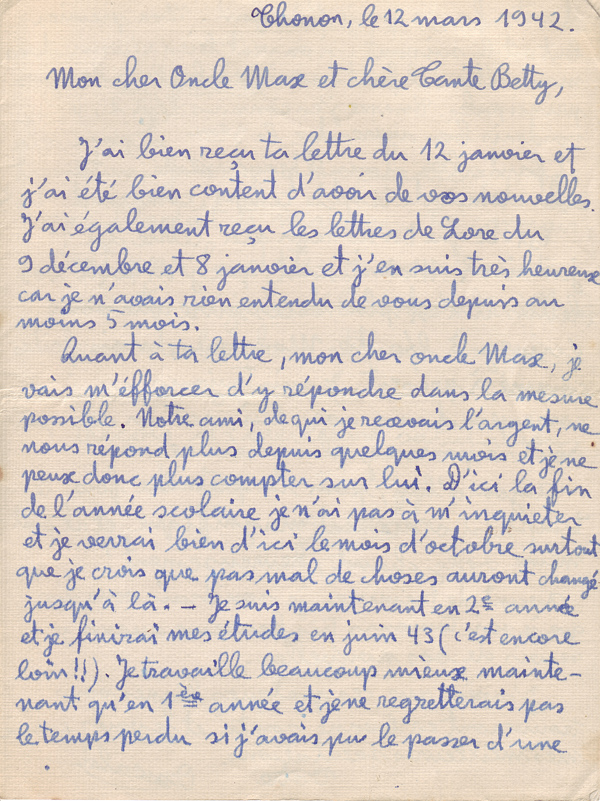 With respect to your letter, my dear Uncle Max, I will endeavour to reply to it as well as possible. Our friend, from whom I was receiving money has not responded further for some months and I therefore can’t count on him any longer. From now until the end of the school year I won't have to worry, and I will be fine until October, especially as I believe that many things will have changed by then. – I am now in the 2nd year and I will finish my studies in June 43 (it’s still far off!!). I work much better now than in the 1st year and I would not regret the lost time if I had be able to spend it in another way than I did. My main goal is the following: if one really wants to succeed in my profession, it is necessary to know how to speak the 3 main languages. As I already know 2 of them, I would really like to learn the third and to do this, it is necessary to go to the country itself otherwise this takes too much time, do you understand?