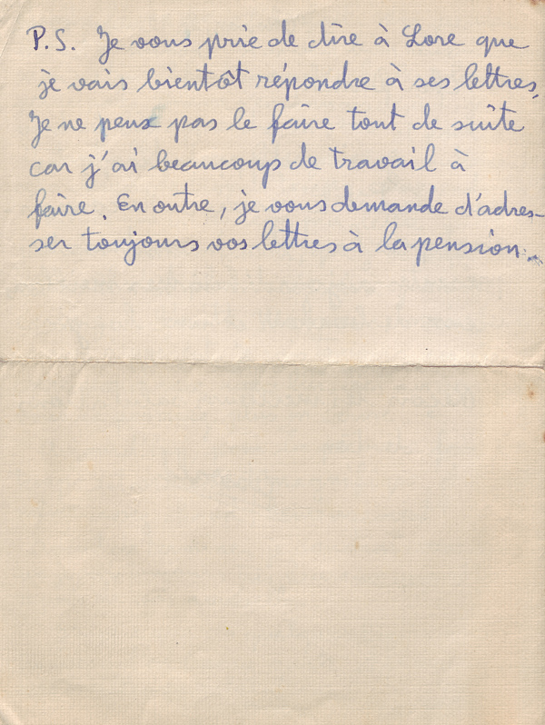 P.S. Please tell Lore that I am going to reply to her letters soon. I can’t do it straight away as I have a lot of work to do. Furthermore, I request that you always address your letters to the pension.