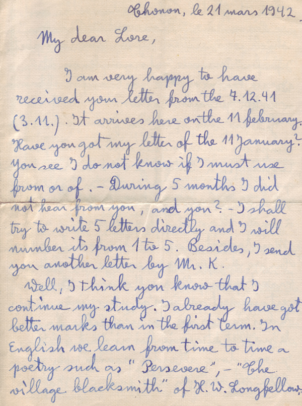 (English in original) I am very happy to have received your letter from the 4.12.41 (3.11). It arrives here on the 11 February. Have you got my letter of the 11 January? You see I do not know if I must use from or of. – During 5 months I did not hear from you, and you? – I shall try to write 5 letters directly and I will number its from 1 to 5. Besides, I send you another letter by Mr. K.