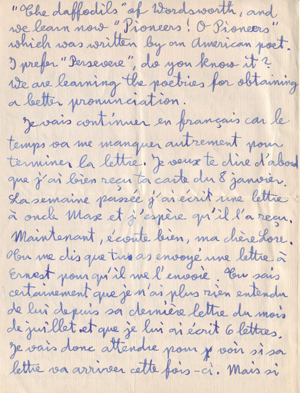 (French in original) I am going to continue in French for otherwise I am going to run out of time to finish the letter. I want to tell you first that I have safely received your card from the 8 January. Last week I wrote a letter to Uncle Max and I hope that he received it.