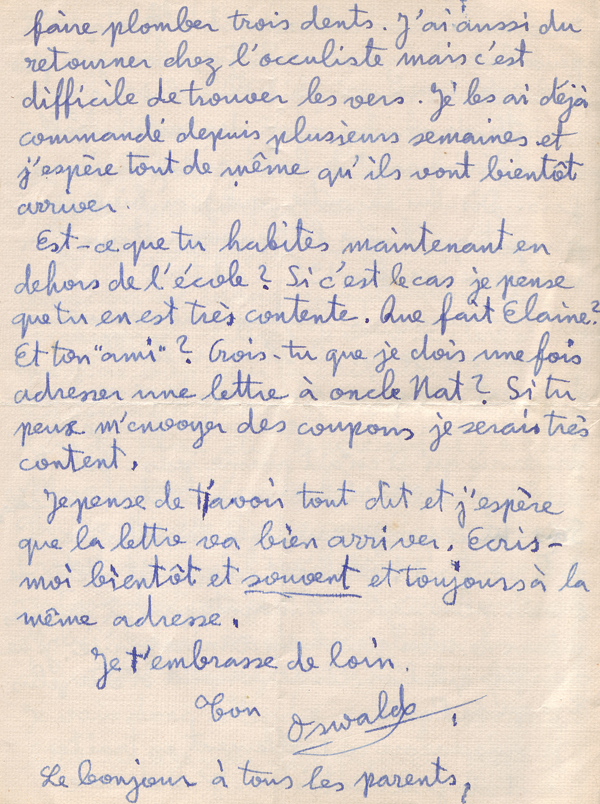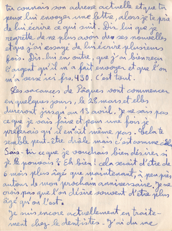 Now listen well, my dear Lore. You tell me that you sent a letter to Ernest for him to send to me. You most probably know that I have not heard anything from him since his last letter in July and that I wrote 6 letters to him. Therefore I am going to wait and see if his letter is going to arrive this time. But if you know his current address and you are thinking of sending him a letter, then I ask you to write the following to him: Tell him that I am sorry not to have any more of his news and that I have tried to write to him several times. Tell him furthermore, that I received safely the money that he had sent to me and that I was paid 430 frs here. That’s all.