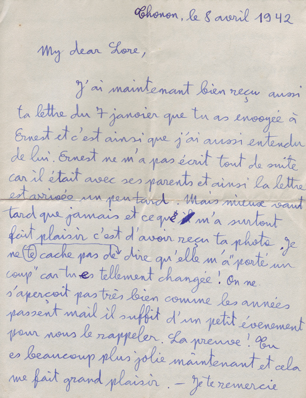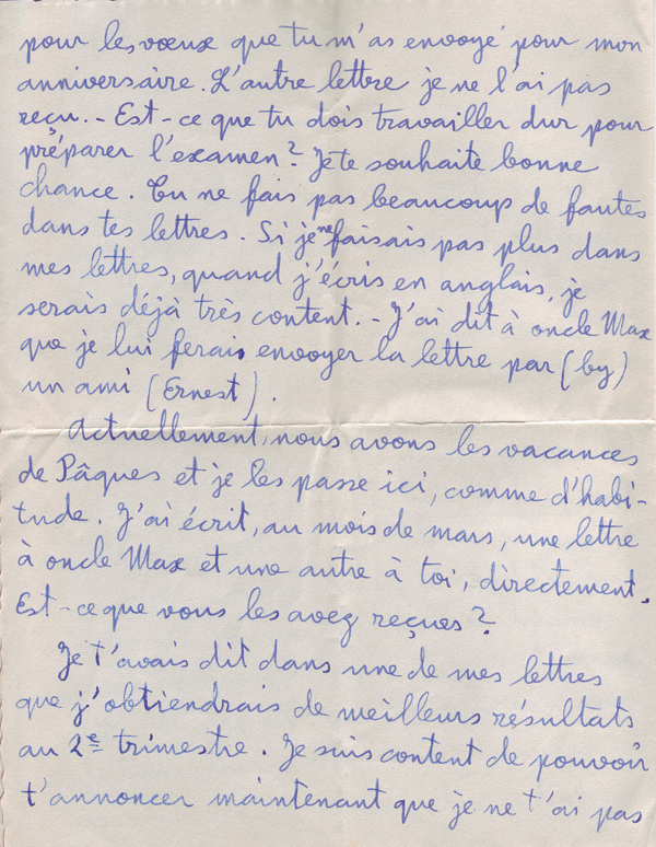 I have now also safely received your letter from the 7th January that you sent to Ernest and so I have also heard from him. Ernest didn’t write to me straight away for he was with his relatives and so the letter arrived a little late. But better it goes late than never and that which gave me pleasure above all was to have received your photo. I won’t hide from saying that it “gave me a shock” for you have really changed! One doesn’t realise very well how the years pass, but a little event is enough to remind us. The proof! You are much prettier now and that gives me great pleasure. – I thank you for the wishes that you sent me for my birthday. The other letter I haven’t received. Do you have to work hard to prepare for your exams? I wish you good luck! You don’t make a lot of mistakes in your letters. If I didn’t make any more in my letters when I write in English, I would be already very happy! I told Uncle Max that I will be able to send a letter to via a friend (Ernest).At the moment, we have the Easter Holidays and I am spending them here as usual. In March, I wrote one letter to Uncle Max and another to you directly. Have you both received them?