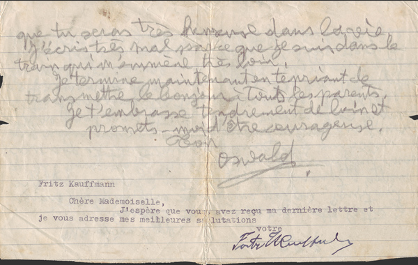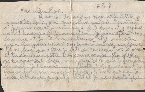 Quand tu aurais recu cette letter je serai loin, je ne sais pas ou. Pourtant si je peux ecrire a notre ami, je le ferai et j’espere qu’il t’enverra la traduction. Je garde tout mon courage et toute ma confiance et je suis sur que nous nous reverrons quand meme un jour. Il ne faut pas etre triste en recevant ces lignes et tu dois aussi etre tres courageuse. La guerre se terminera bien un jour et le bien triomphera du mal. Je t’envoie une photo tres recente et tu la gardera en mon souvenir. J’ai bien recu tes deux lettres de juin et juillet et je souhaite que tu seras tres heureuse dans la vie.