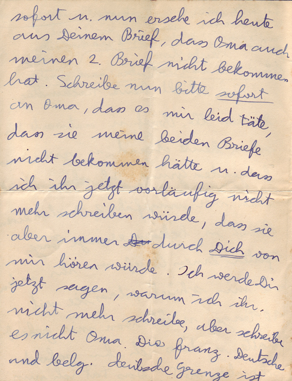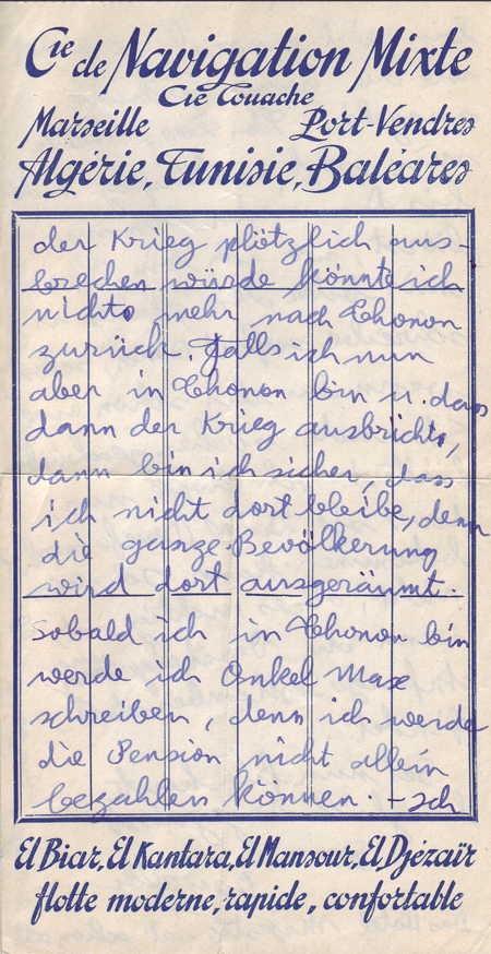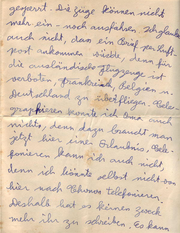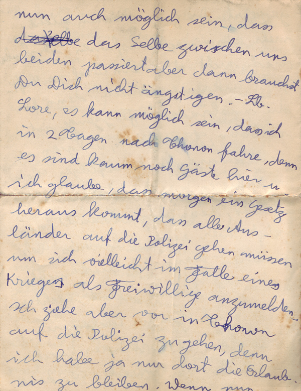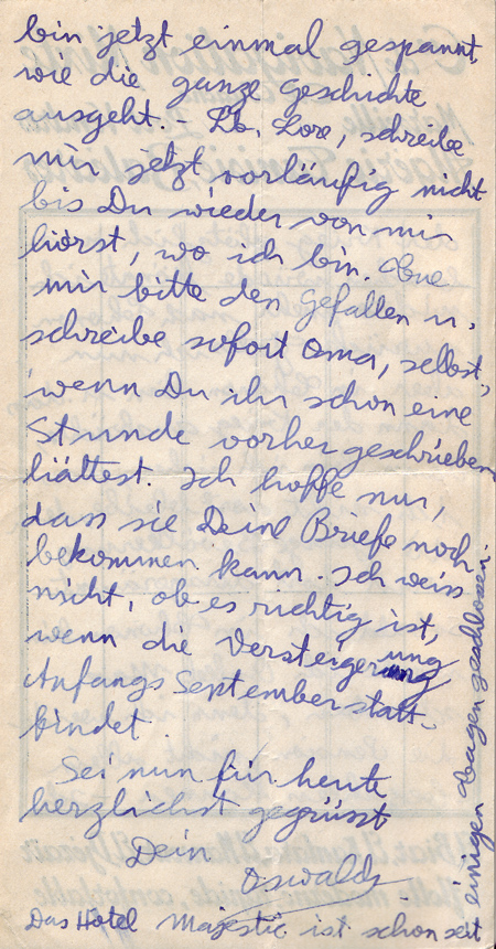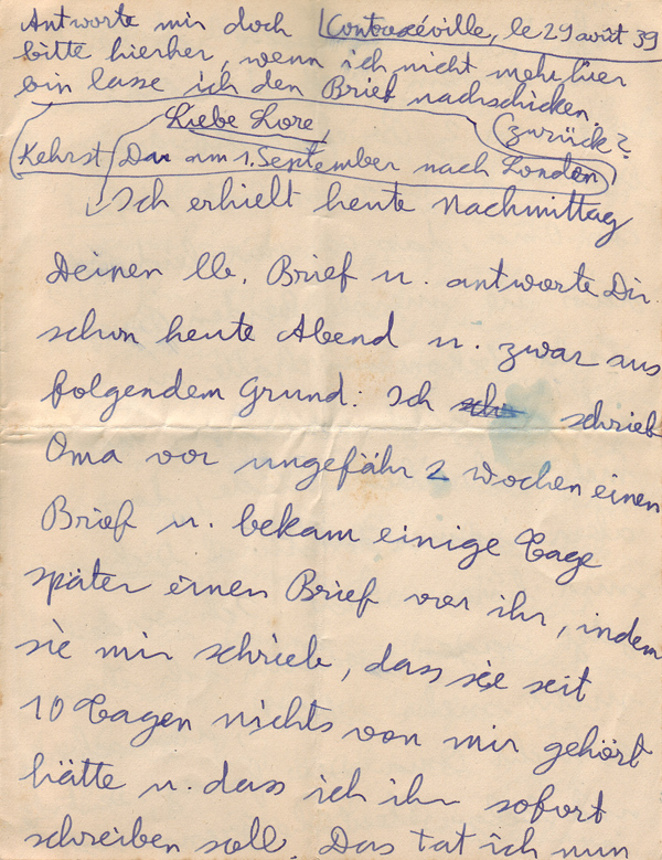 I received your letter this afternoon and am answering it already this evening for the following reason. I wrote to Oma about two weeks ago and received a letter from her a few days later in which she said she had not heard from me for the last ten days and that I must write immediately. I did so and now I see from your letter that Oma did not receive my second letter either. Write immediately to Oma that I am sorry she did not receive my two letters and that I would not be writing to her for the time being but that she would hear about me through you. I will tell you why I won’t be writing to her but don’t tell Oma. The French German and Belgium German frontiers are closed. The trains can no longer go in or out. I don’t think letters sent airmail would arrive because foreign planes are forbidden to fly over France, Belgium and Germany. I am not able to send a telegram because one requires special permission. I can’t telephone either because I am not able to phone even Thonon. For this reason there is no point in writing. The same could happen to us but you need not be anxious about this. Dear Lore, it is possible that I will return to Thonon in two days because there are hardly any guests here and I think there will be a new law that all foreigners must go to the police to register as volunteers in case of war. I prefer to go to the police in Thonon because I only have permission to stay there. If war were to break out suddenly, I could not return to Thonon. In case I am in Thonon and war breaks out I am sure I could not stay there because the whole population would be moved. As soon as I am in Thonon I will write to Uncle Max because I can’t pay the Pension alone. I am tense to know how things will develop. Lore, don’t write to me for the time being till you hear where I am. – Do me the favour and write to Oma immediately, even if you only wrote to her an hour ago. I only hope she can still receive your letters. I don’t know if it is the right thing to have the auction at the beginning of September. (Oma and Opa were getting ready to come to England. The contents of the flat in Scheffelstrasse 11 were planned to be auctioned)
