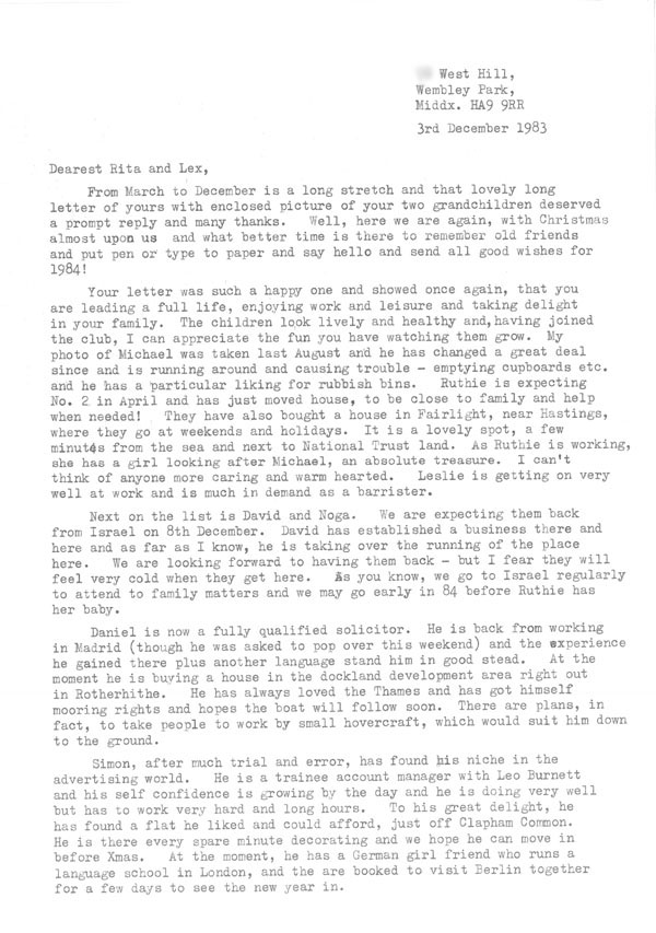 Next on the list is David and Noga. We are expecting them back from Israel on 8th December. David has established a business there and here and as far as I know, he is taking over the running of the place here. We are looking forward to having them back – but I fear they will feel very cold when they get here. As you know, we go to Israel regularly to attend to family matters and we may go early in 84 before Ruthie has her baby.