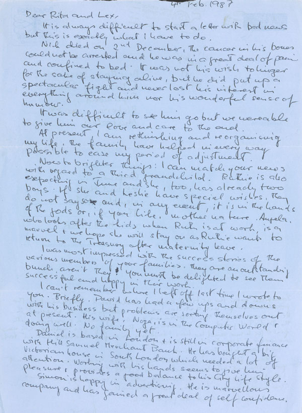 Nick died on 2nd December, the cancer in his bones could not be arrested and he was in a great deal of pain and confined to bed. It was not his wish to linger for the sake of staying alive, but he did put up a spectacular fight and never lost his interest in everything around him nor his wonderful sense of humour.