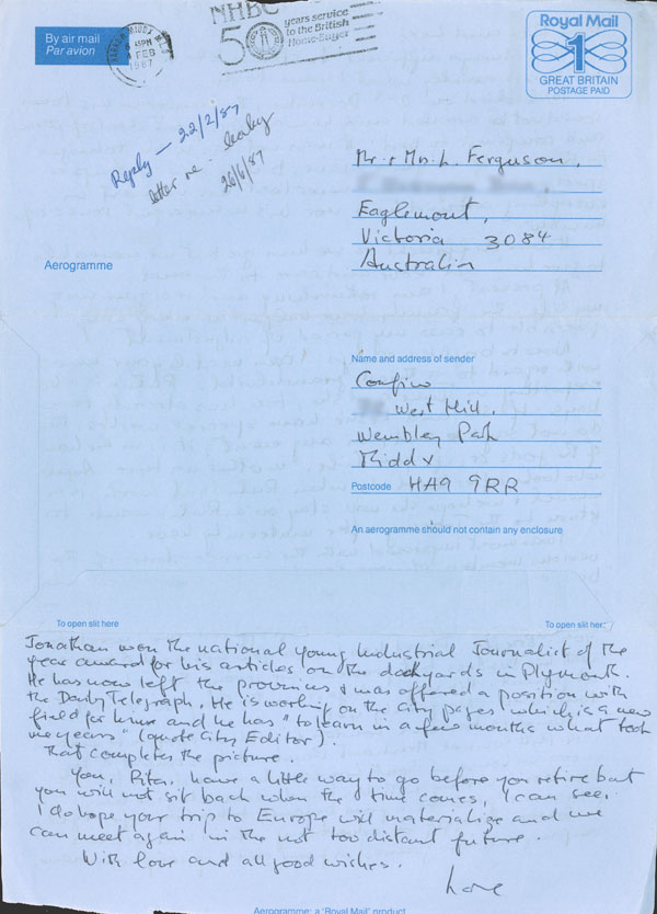 Simon is happy in advertising. He is marvellous company and has gained a great deal of self confidence. Jonathan won the national Young Industrial Journalist of the Year award for his articles on the dockyards in Plymouth. He has now left the provinces and was offered a position with the Daily Telegraph. He is working on the City pages which is a new field for him and he has “to learn in a few months what took me years” (quote City Editor).