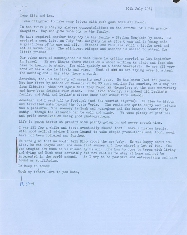 We were glad that we could tell Nico about the new baby. He was happy about it. Also, he met Shayne when she came last summer and they shared a lot of fun. You can imagine how much he is missed by us all. One has to come to terms with living and dying and Nick most certainly did not want me to stay at home and not be interested in the world around. So I try to be positive and enterprising and have found my equilibrium.