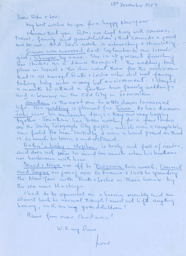 Simon was married last September to an Israeli girl, Shayne by name. She is at present finishing her studies as a dance therapist. The wedding took place in Israel and the clan went there for the occasion – that is all except Ruth and Leslie who did not fancy taking baby into a very hot environment. I stayed a month to attend a further two family weddings and a Seminar in the Old City in Jerusalem.