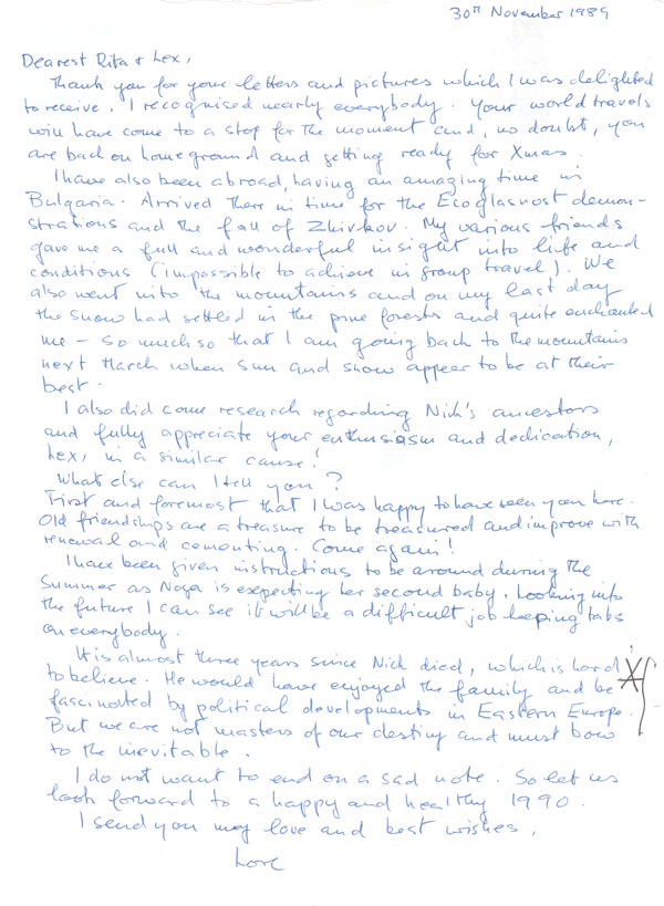 I have also been abroad, having an amazing time in Bulgaria. Arrived there in time for the Ecoglasnost demonstrations and the fall of Zhivkov. My various friends gave me a full and wonderful insight into life and conditions (impossible to achieve in group travel). We also went into the mountains and on my last day the snow had settled in the pine forests and quite enchanted me – so much so that I am going back to the mountains next March when sun and snow appear to be at their best.