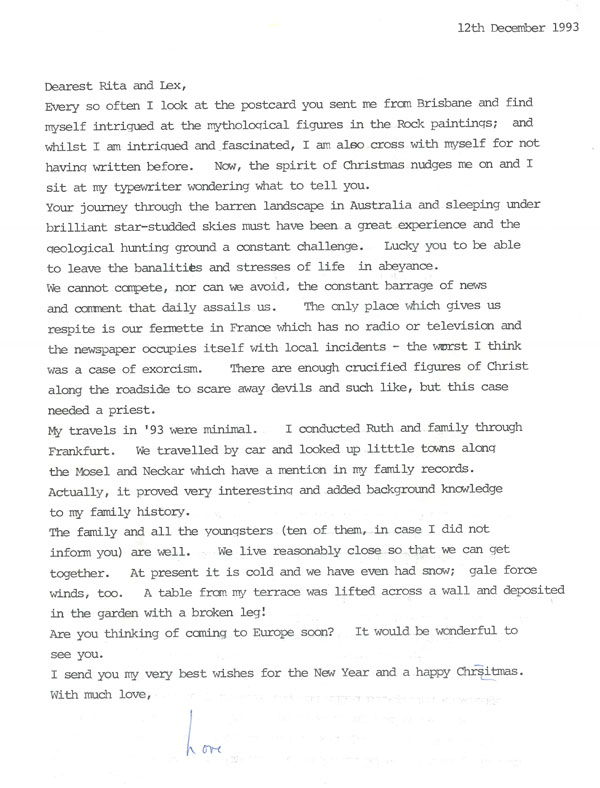 Every so often I look at the postcard you sent me from Brisbane and find myself intrigued at the mythological figures in the Rock paintings; and whilst I am intrigued and fascinated, I am also cross with myself for not having written before. Now, the spirit of Christmas nudges me on and I sit at my typewriter wondering what to tell you.